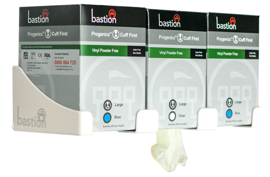 This wall-mounted plastic dispenser supports the Progenics Cuff-First glove boxes so that each glove can be pulled hygienically from the base. The Progenics Cuff-First dispensing system has proven to reduce wastage and improve overall hygiene.