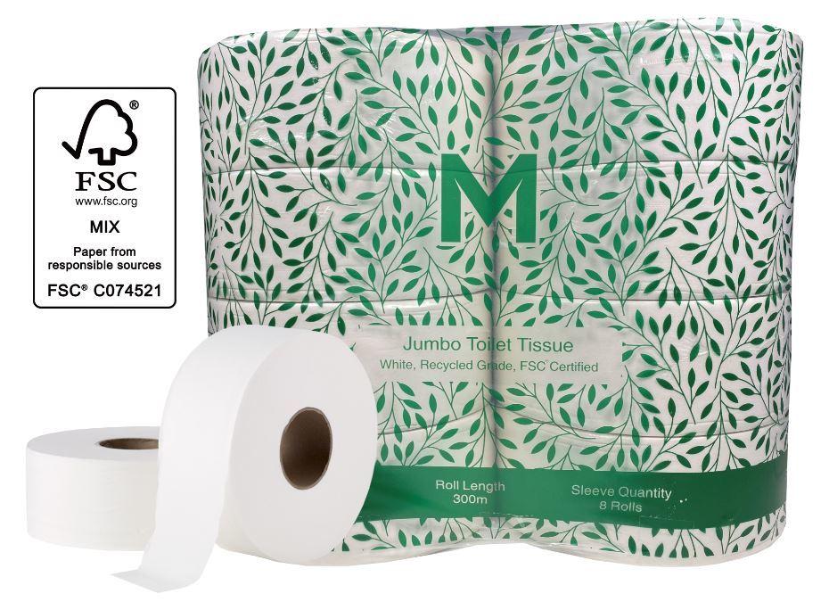 Recycled Jumbo Toilet Tissue - White, 2 Ply, 300m (8) 8 Rolls/PolyPack.
