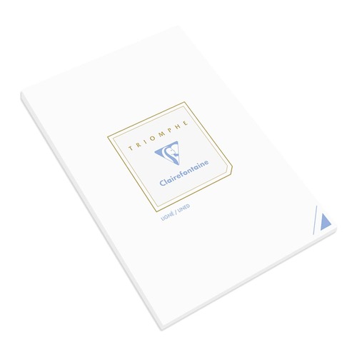 This Triomphe writing pad is filled with 50 sheets of Clairefontaines world famous 90gsm brushed vellum paper, the same exceptionally smooth paper found in Clairefontaine notebooks which is fountain pen-friendly. Hard-backed cover provides support and the glue binding allows pages to be removed with ease. Made in France by Clairefontaine. Match with Triomphe envelopes. A5 size. 50 8mm lined sheets.